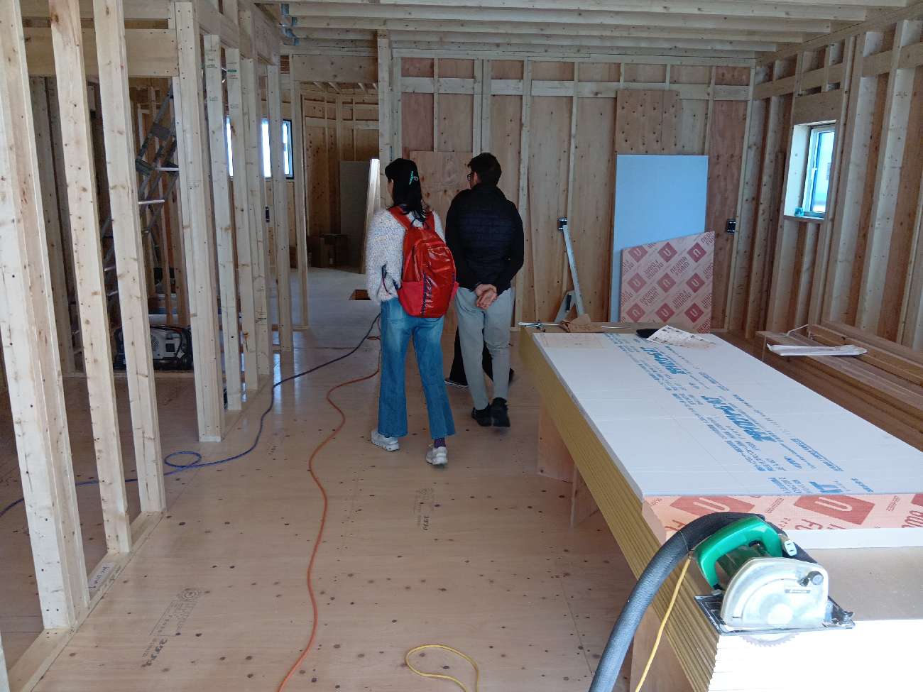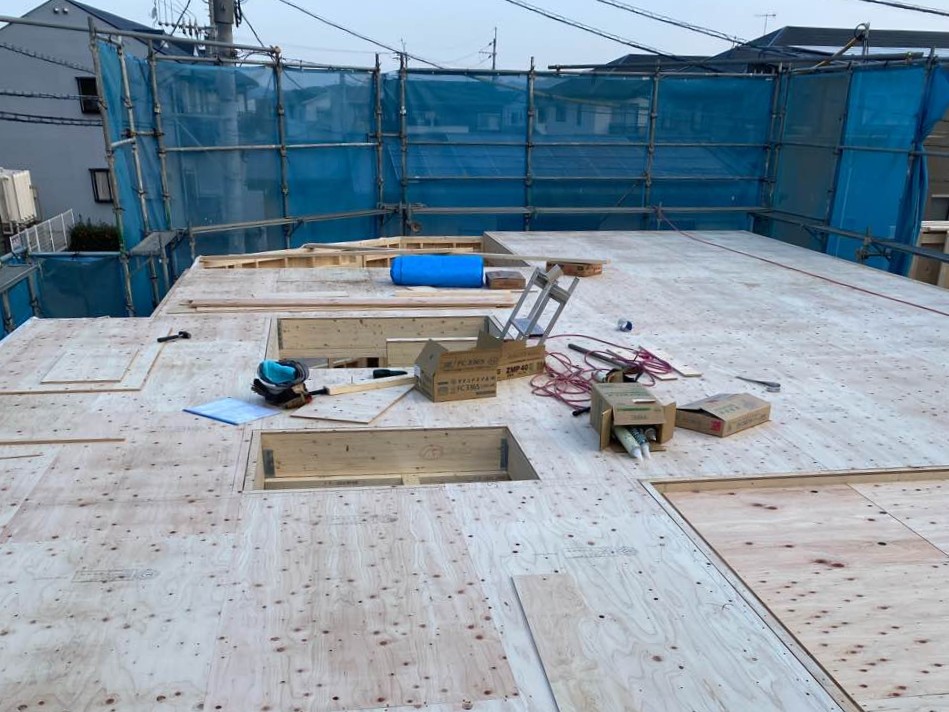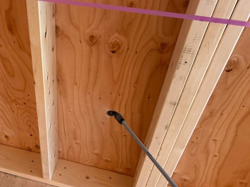 断熱工事が進んでいます。弊社ではネオマフォームと呼ばれる厚さ45㎜の断熱材(屋根は80㎜)を施します。また、気密性を高めるため、継ぎ目を専用テープで塞ぎます。