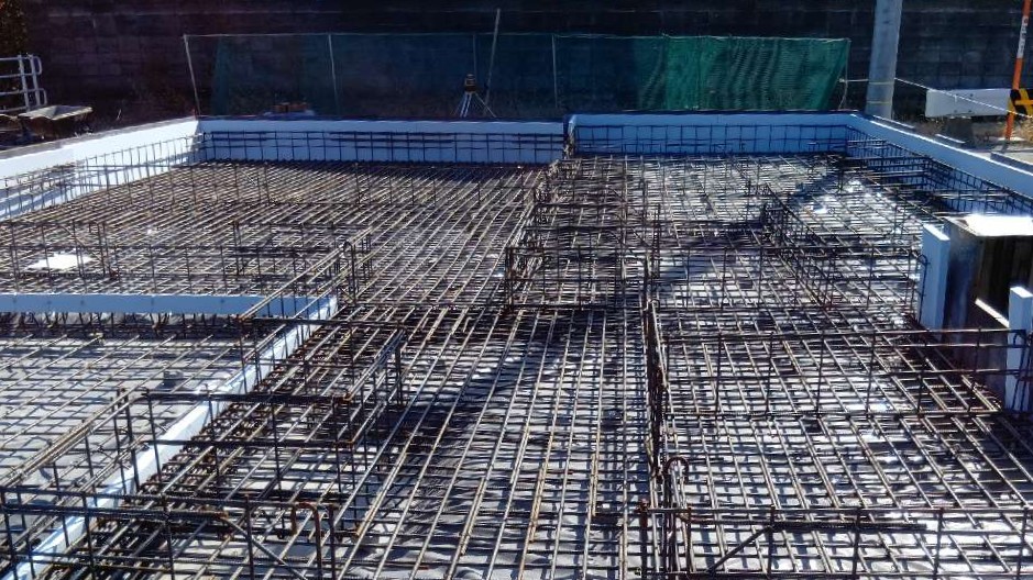 基礎配筋が完了しました。地盤の上にシロアリ対策と防湿を兼ねたターミダンシートを敷き、その上に13㎜異型鉄筋を20㎝間隔で組んでいます。