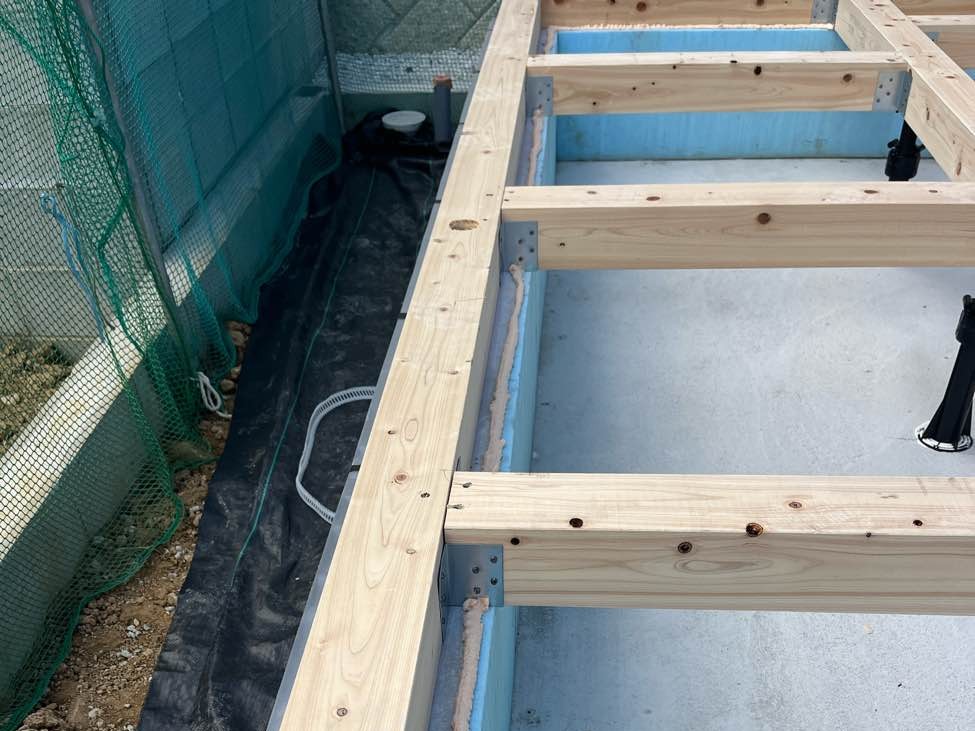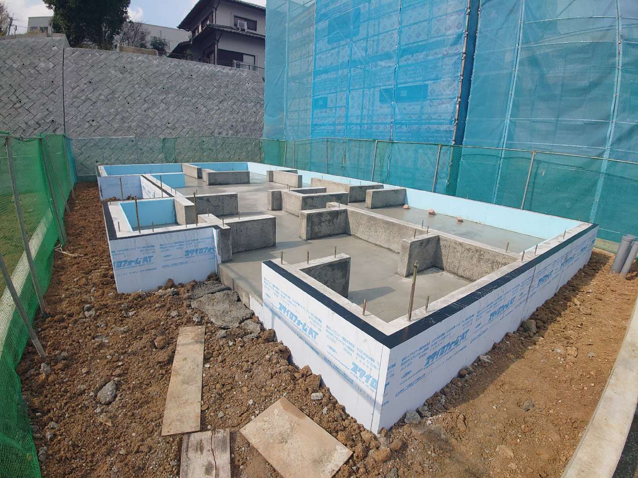 コンクリート工事を経て、建物基礎が完成しました。床下の設備配管を行った後、構造躯体工事の準備に取り掛かります。