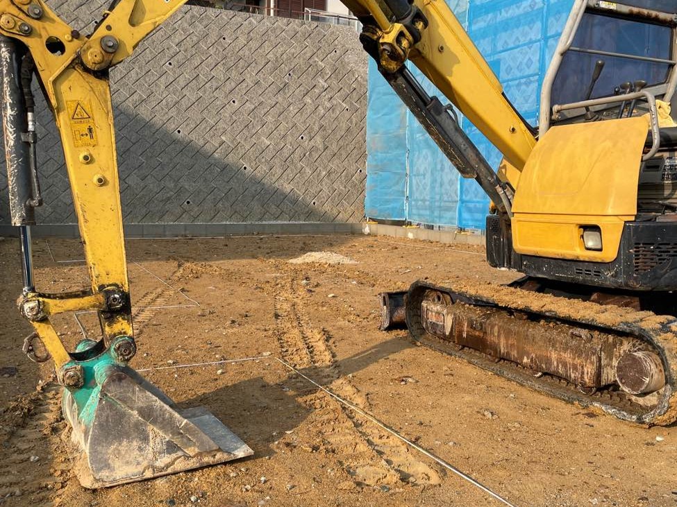 着工しました。バックホーで建物基礎の下部の部分を平坦に仕上げ、専用機材を用いて転圧を行います。