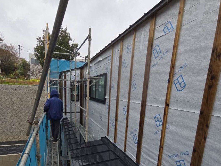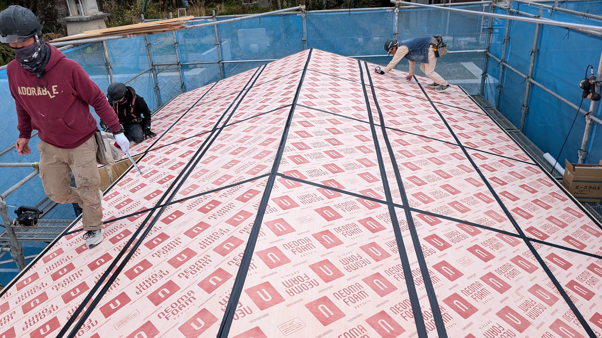 第三者機関である日本住宅保証検査機構(JIO)様の防水下地検査を受けました。断熱材の上に貼ったアクアシルバーウォールシングル(遮熱透湿防水シート)の状態等、各所雨漏りしないかを確認します。