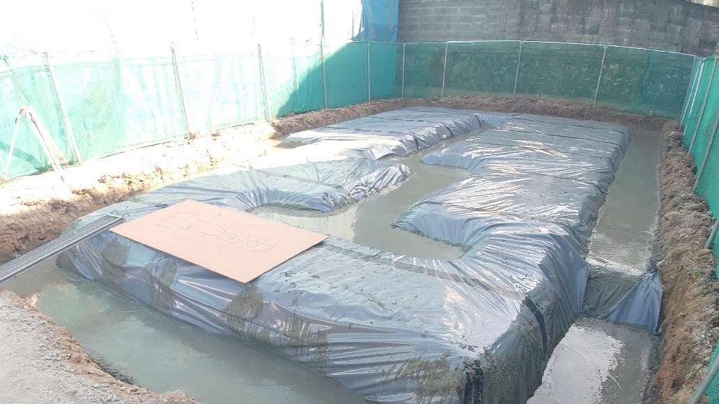コンクリート工事を経て、建物基礎が完成しました。床下の設備配管を行った後、構造躯体工事の準備に取り掛かります。