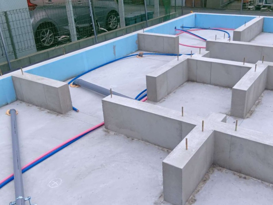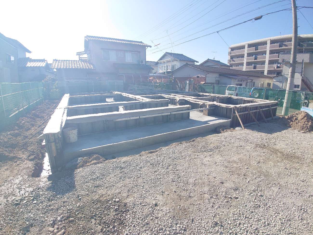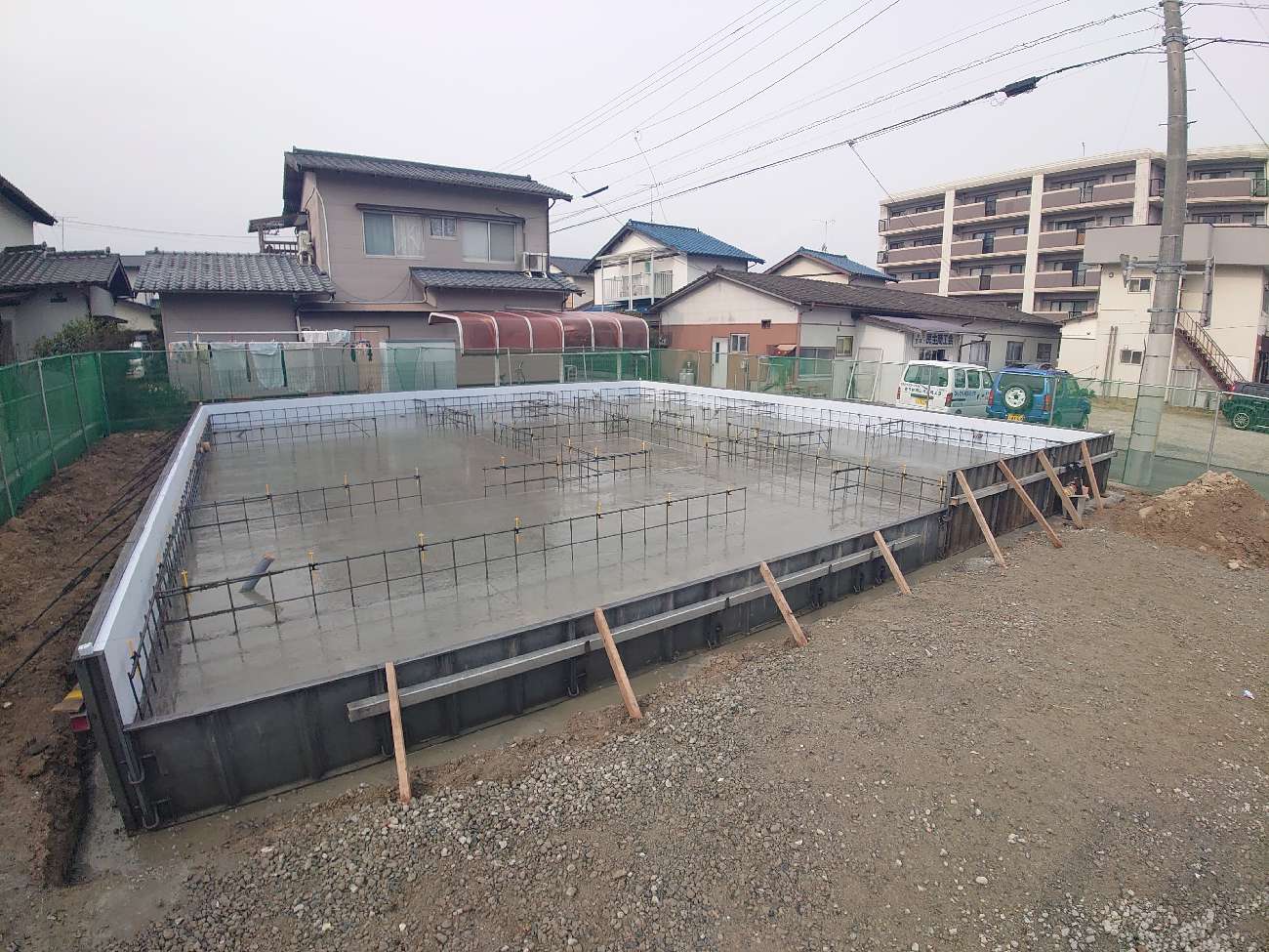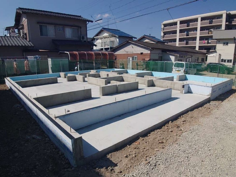 建物基礎が完成しました。床下の設備配管を行った後、構造躯体工事の準備に取り掛かります。