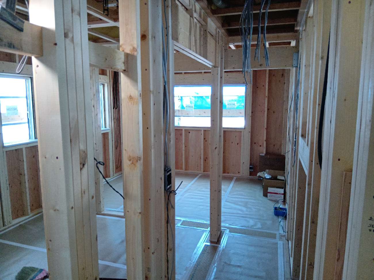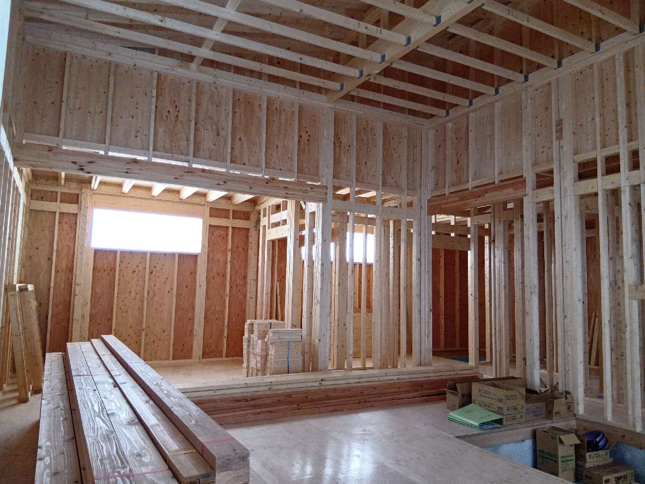 内部造作工事がはじまりました。サッシを取り付け、各所下地工事やフローリング工事へ進んでいきます。