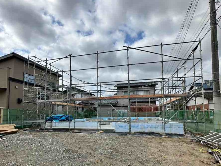 躯体工事に先駆けて、外部足場を組み上げています。
