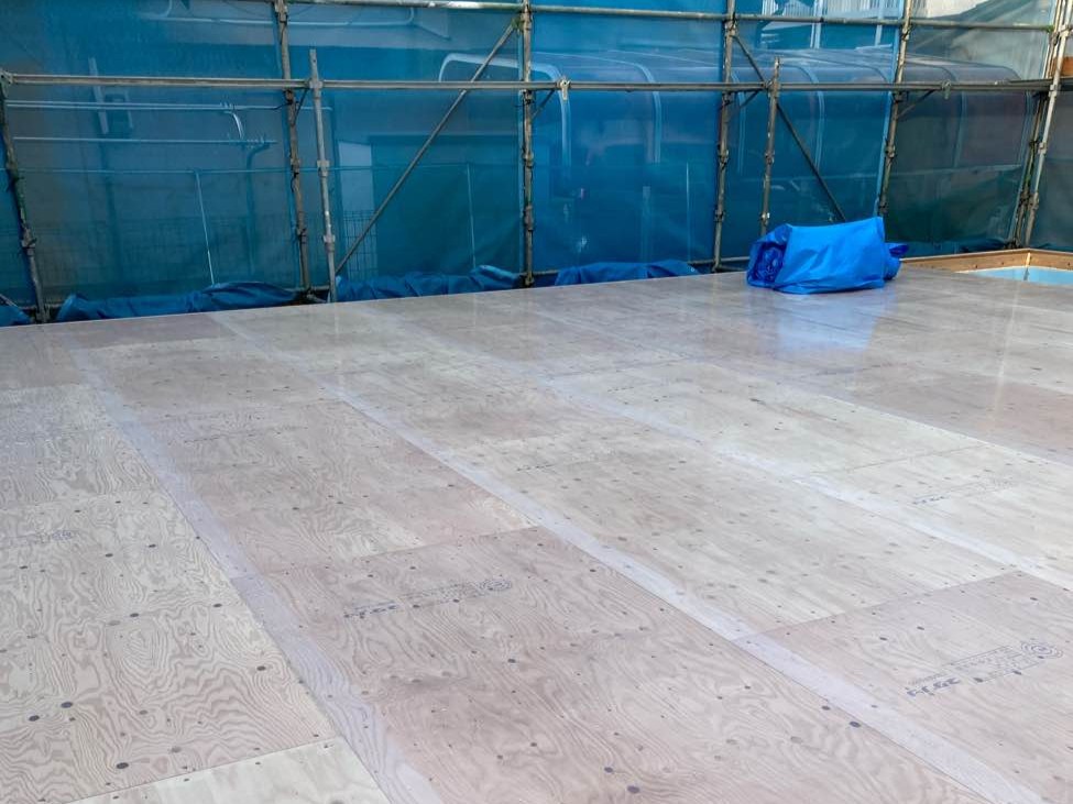躯体工事に取り掛かりました。基礎の上に土台材を敷き、28㎜の合板を敷き込んで専用の釘で止めていきます。この後いよいよ上棟です!