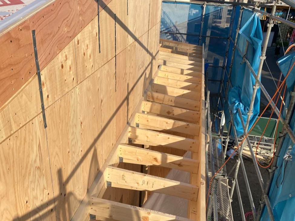 上棟作業が進んでいます。専属の大工さんが構造体を組み立てていきます。