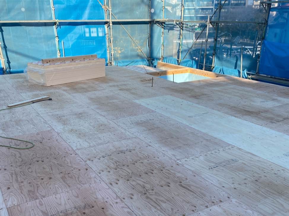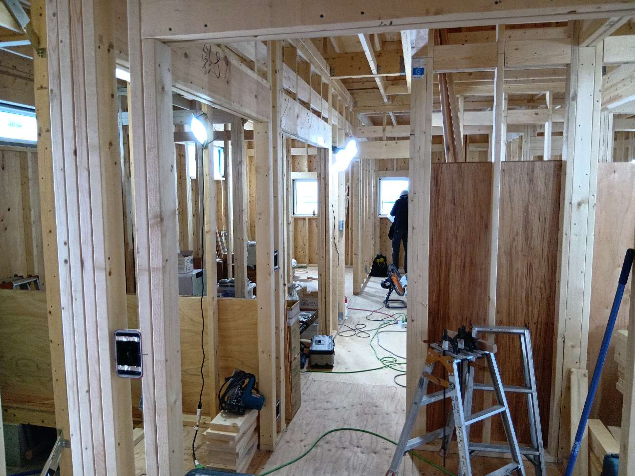 内部造作工事がはじまりました。サッシを取り付け、各所下地工事やフローリング工事へ進んでいきます。