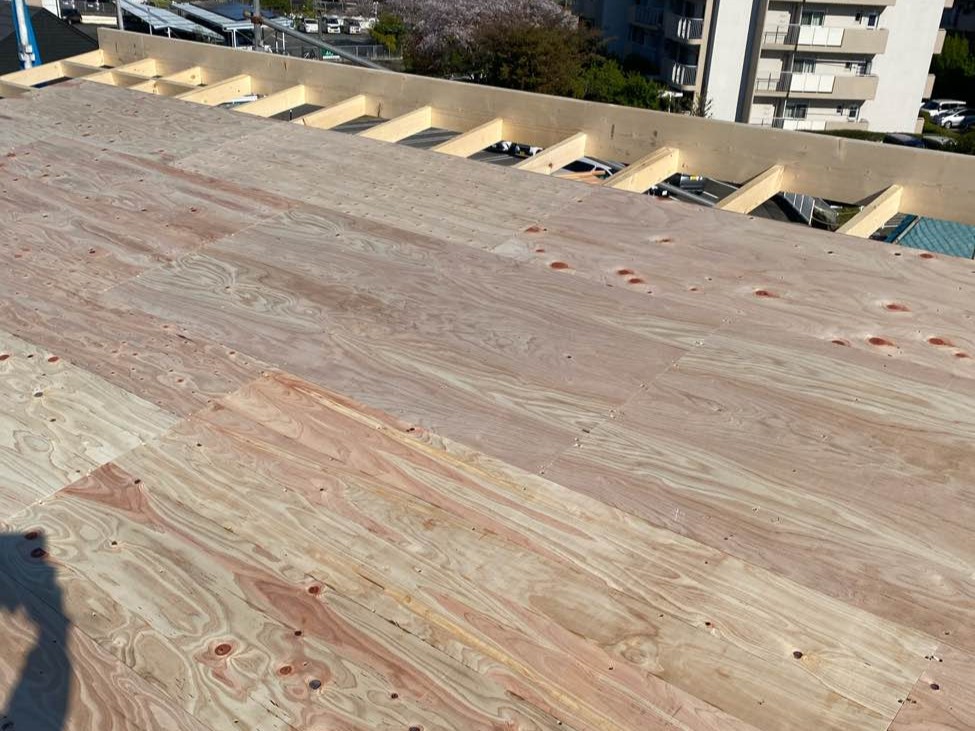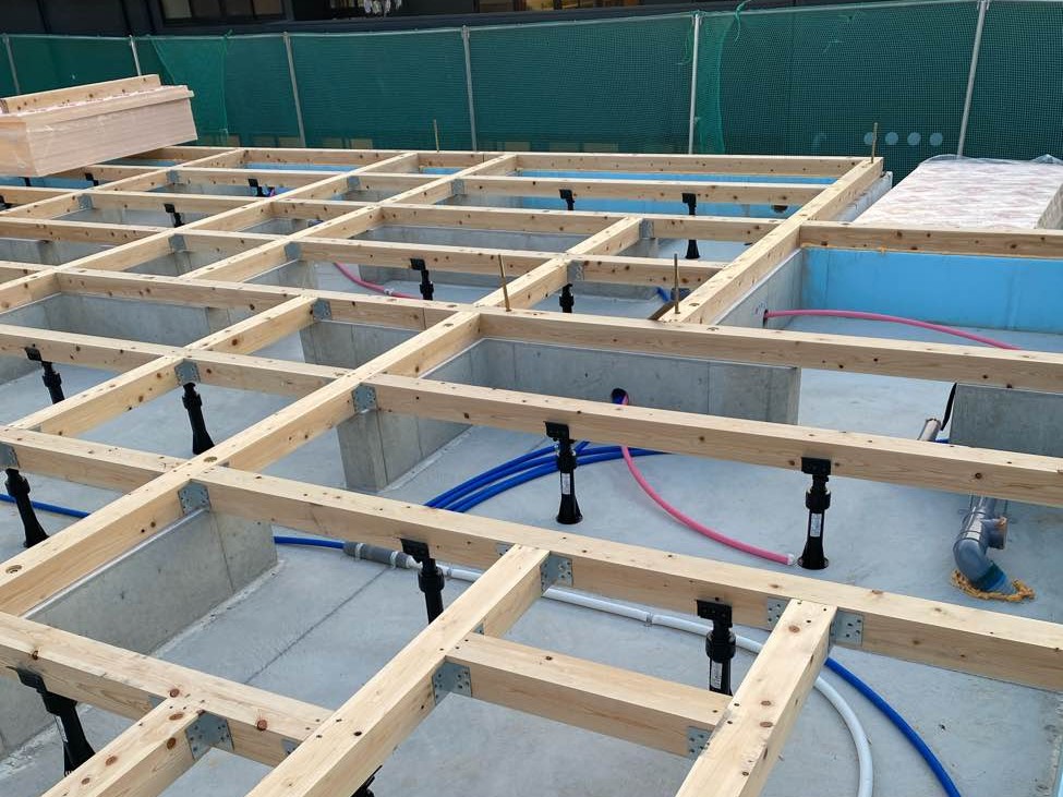躯体工事に取り掛かりました。基礎の上に土台材を敷き、28㎜の合板を敷き込んで専用の釘で止めていきます。この後いよいよ上棟です!