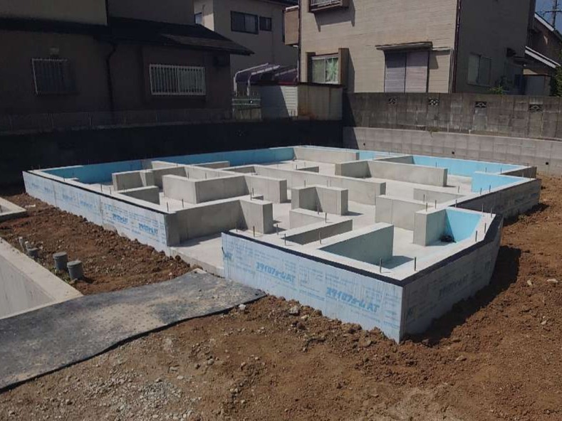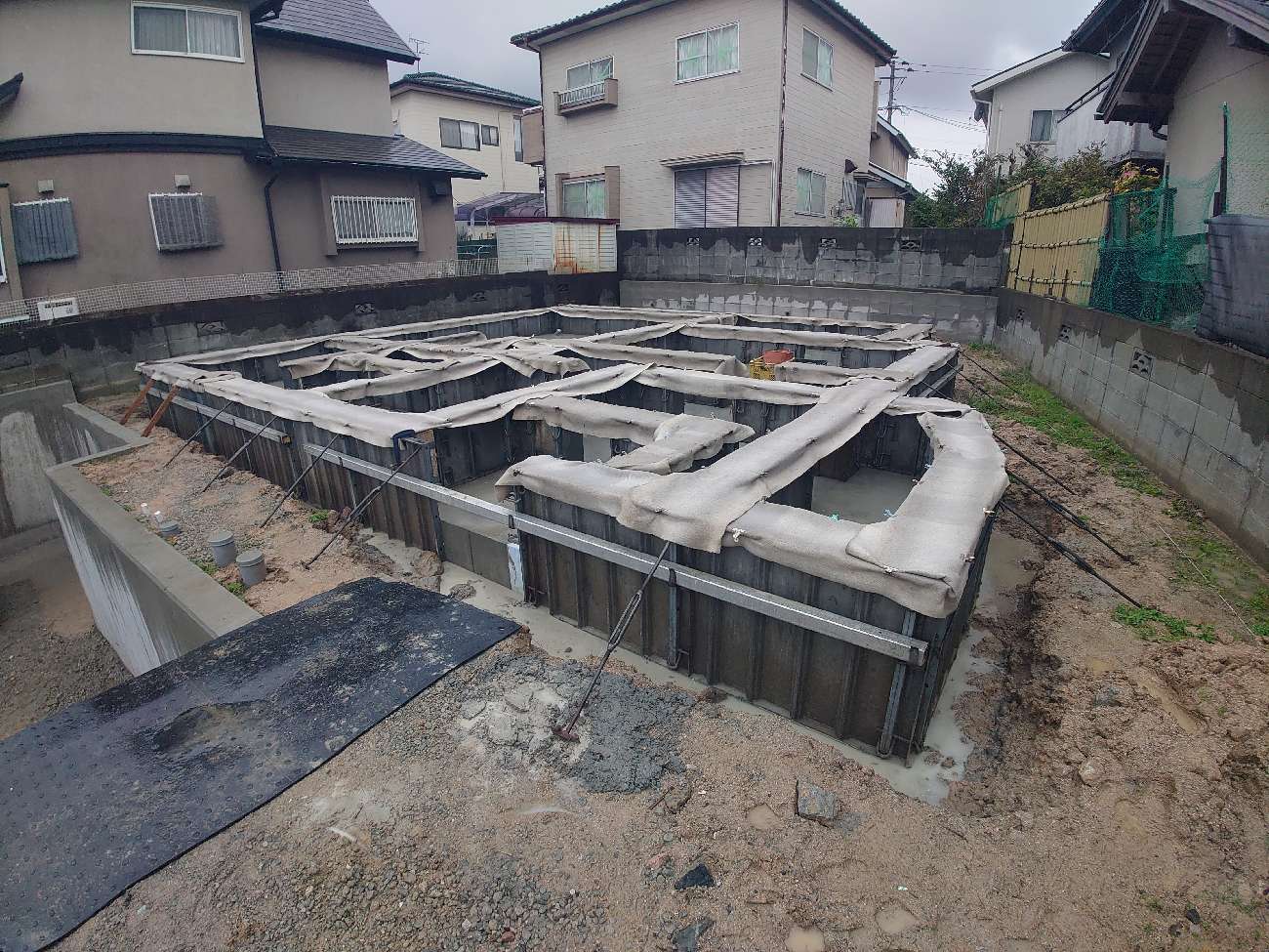 建物基礎が完成しました。床下の設備配管を行った後、構造躯体工事の準備に取り掛かります。