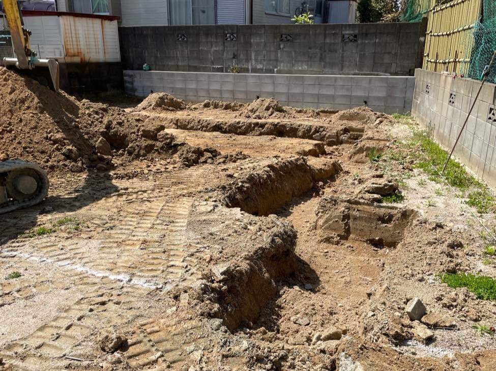 着工しました。バックホーで建物基礎の下部の部分を平坦に仕上げ、専用機材を用いて転圧を行います。