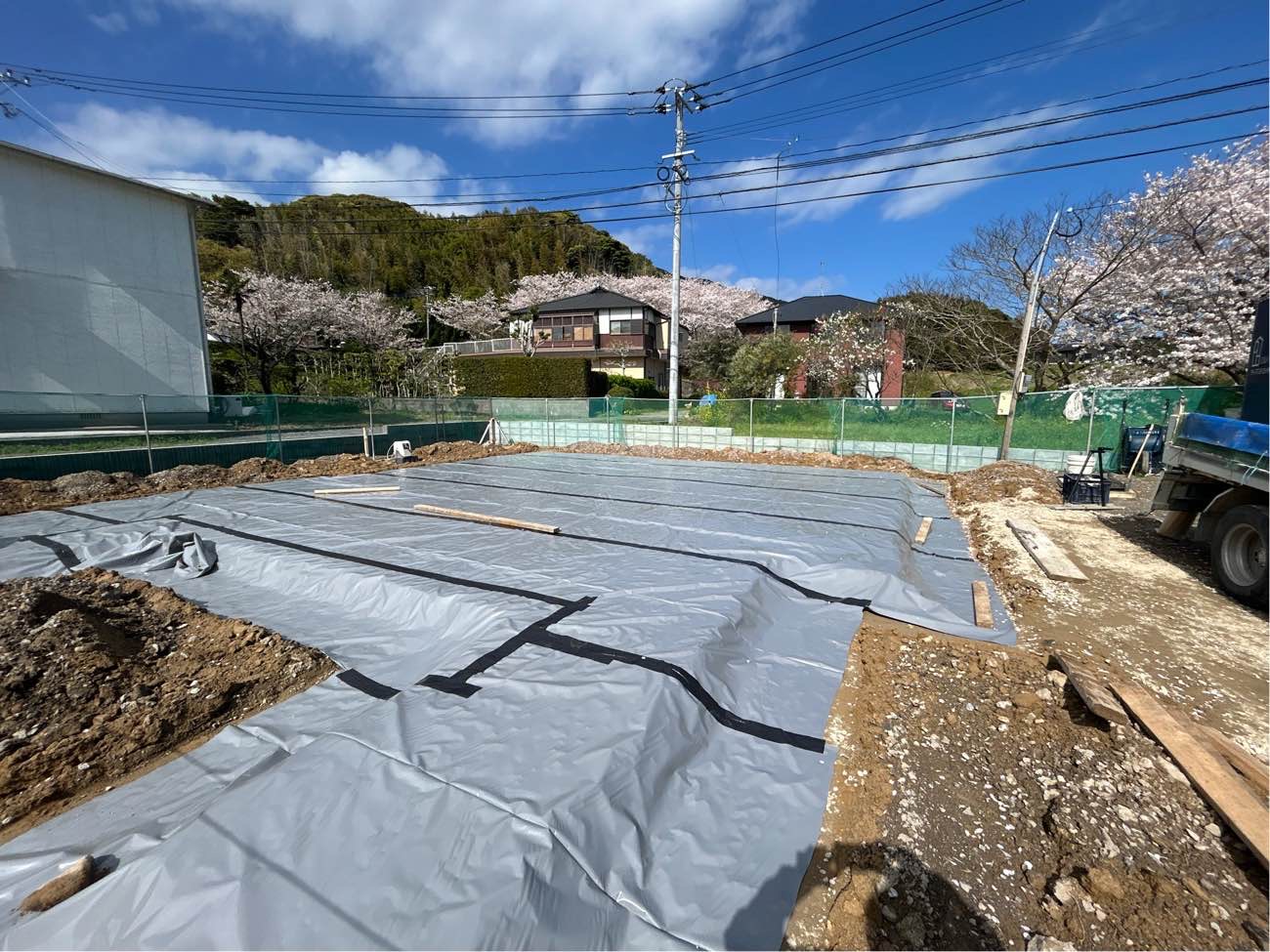 地盤の上にシロアリ対策と防湿を兼ねたターミダンシートを敷いています。