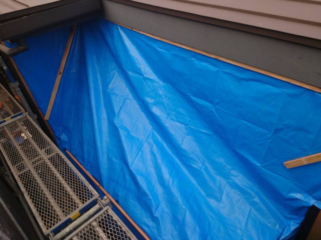 まずは、既存のサッシを残したまま取合い部分の外壁や屋根を解体し、雨が入らないように養生します。
