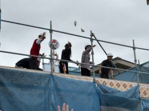 餅まきとは、上棟が無事に終わったことを祝い、工事の安全とお家の完成を祈願する伝統行事です。