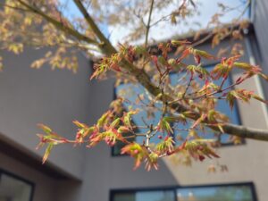 大野城モデルハウスの植栽も、春の訪れとともに新芽が芽吹きだしています。