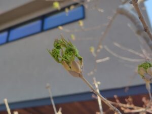 モミジの葉の芽吹き方や、コナラの花など、身近になければ気にも留めない季節の小さな変化を日々感じられるのは、庭がある戸建の良いところの1つですね。