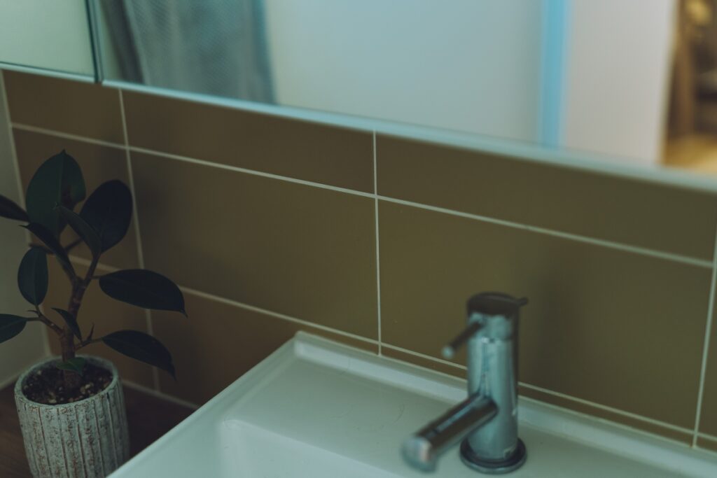 だからこそ、小さなところに大胆さを入れてもいいのではないかと、リビングから見える洗面所の一部に、からし色の大きなタイルを貼ることを提案しました。
