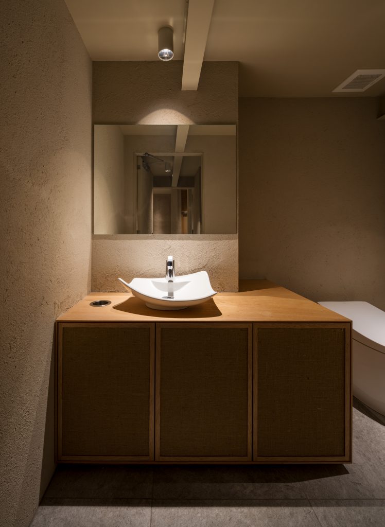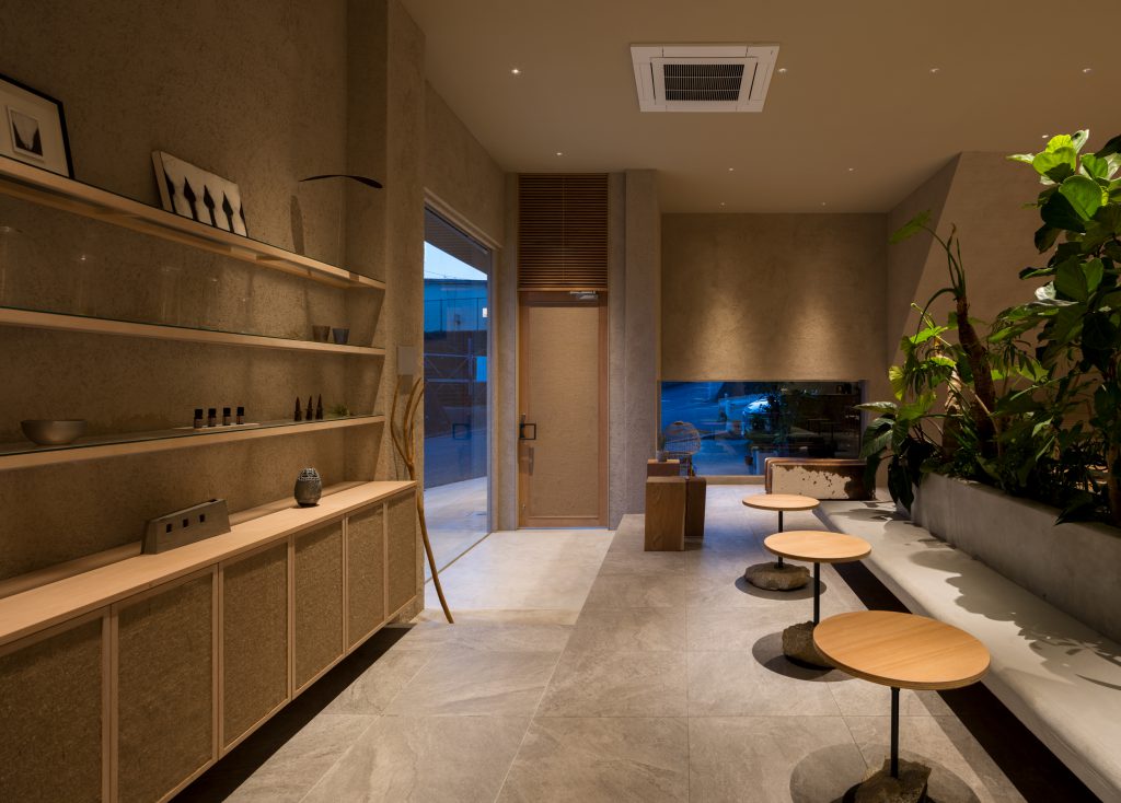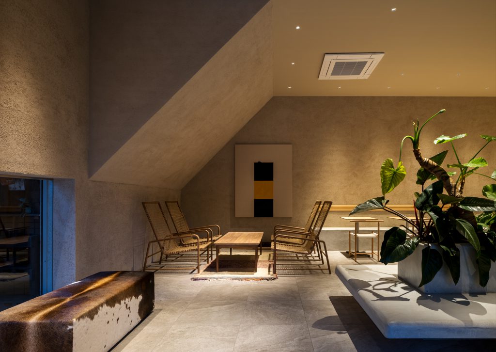 中央にグリーンスペースを設け、土壁で仕上げたぬくもりのある空間。