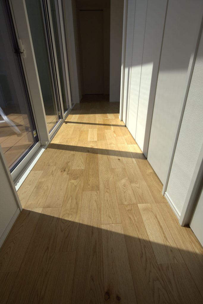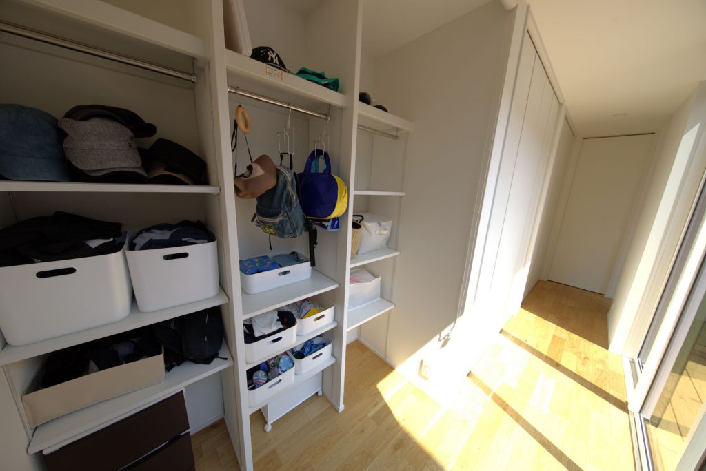収納スペースがたくさん欲しいということで、廊下は一面収納スペースに。 おかげで、物が増えてもお家をきれいに保てます。