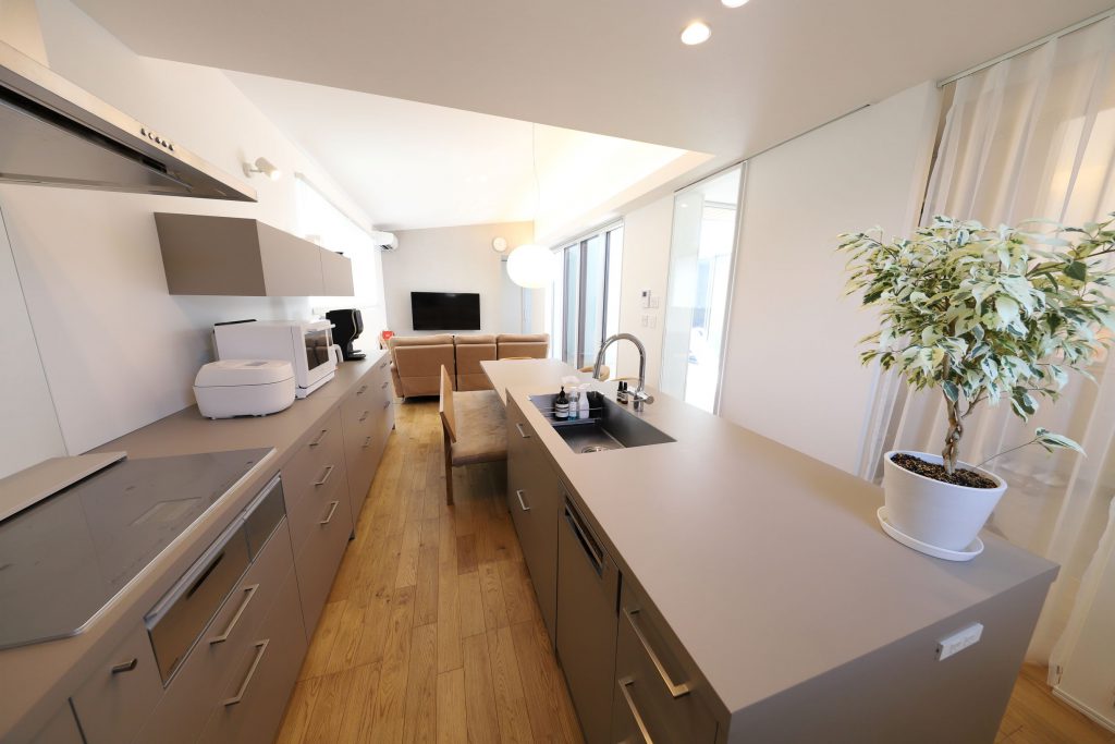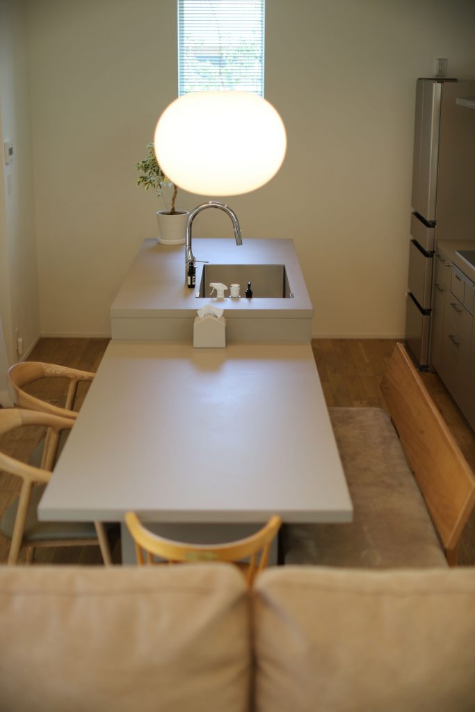 全体的にベージュで統一されたLDKは、中庭で遊ぶお子さまの姿を眺めながら過ごすことができる落ち着いた空間に。