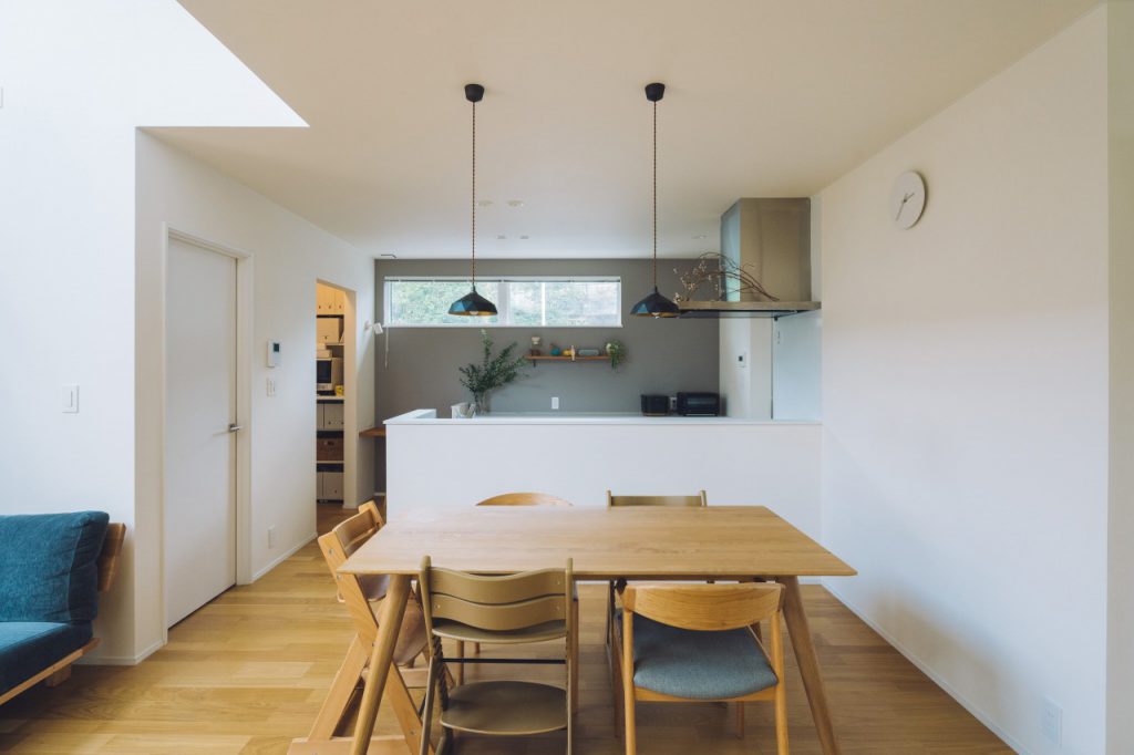 視覚的な広さが十分に感じられる吹抜けのLDKは、ご家族が憧れていたダイニングテーブルを起点に生まれました。設計図を考える際に、ダイニングテーブルのお話を伺っていたため、サイズやデザインを元にLDKの設計を組み立てています。