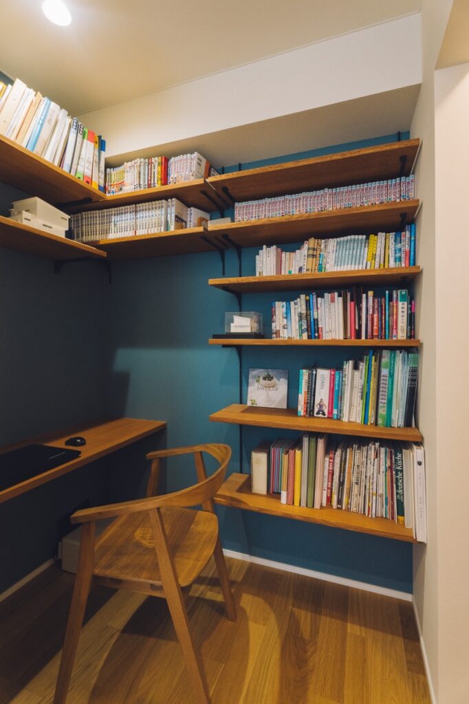 2階廊下の奥のスペースを利用して、ご主人の書斎スペースも。押し入れスペースに隠れるようにデスクカウンターを設置しているので、家族の気配を感じながらも、ほどよいおこもり感で集中して作業ができます。